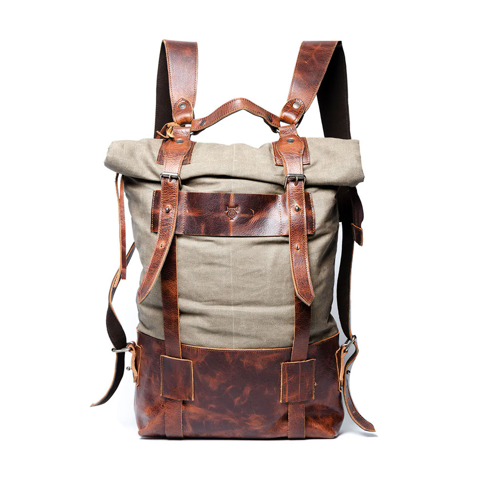 Canvas acabado vintage, colores negro, caqui, olivo y gris oxford. Piel 100% Bovino. Forro 100% algodón. Herraje Metálico reforzado y cierre ykk. Piel Paddock.